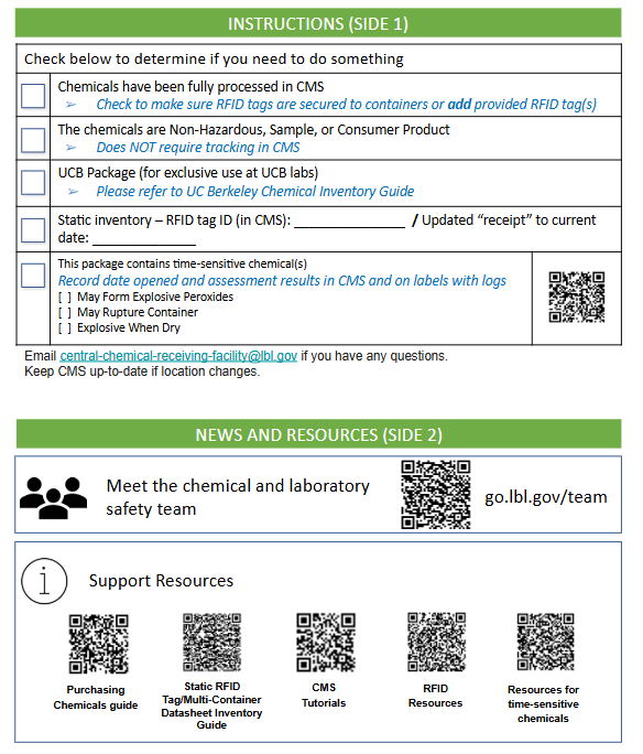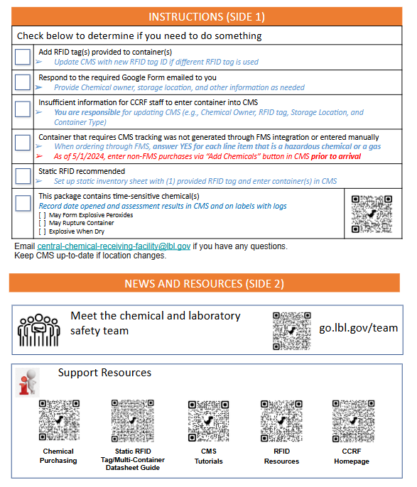 - Email us at central-chemical-receiving@lbl.gov or cms@lbl.gov