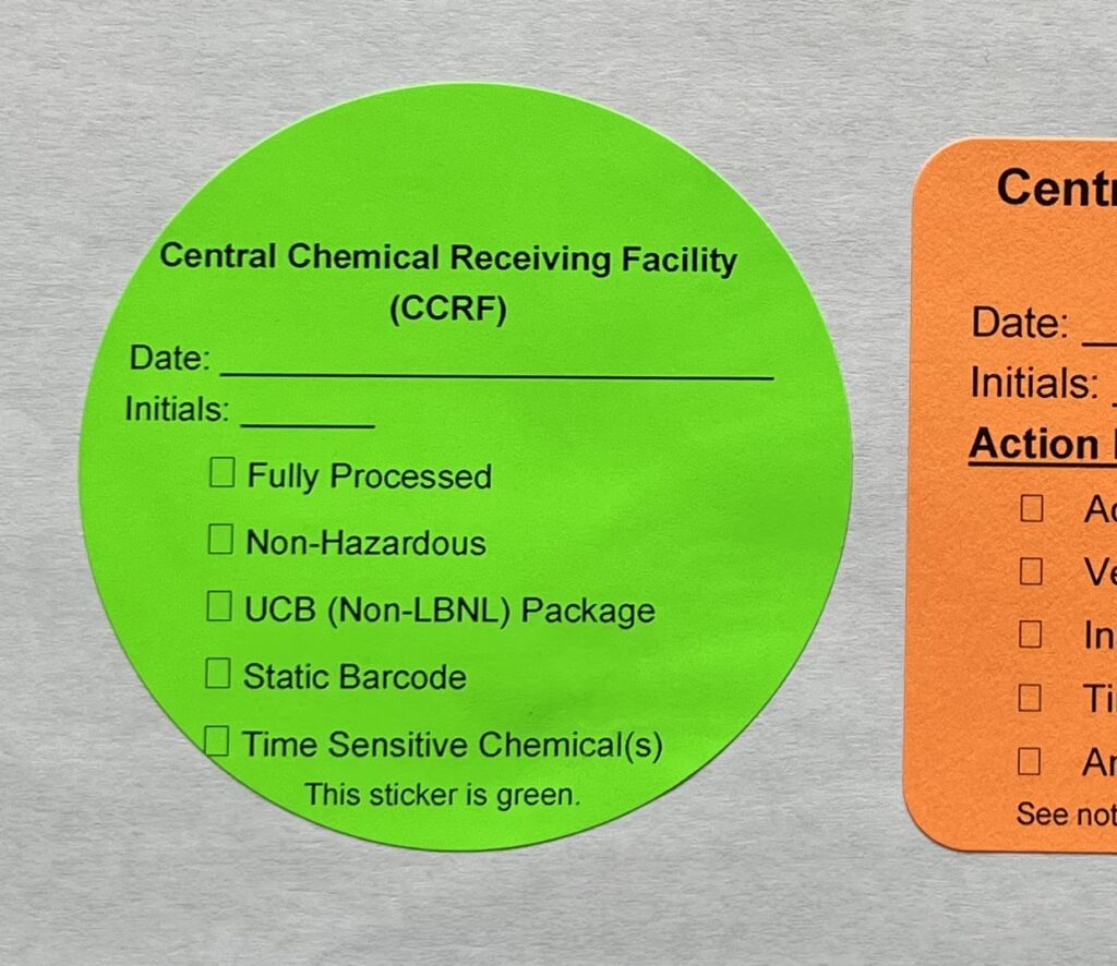 These both help communicate specific follow-up actions you will need to perform upon receiving your package via the color/shape of the sticker and checkboxes as marked by CCRF Staff. Stickers and notices also convey information about the chemicals, such as if they are non-hazardous (CMS tracking not required) or time-sensitive chemicals. Stickers are typically placed near the LBNL shipping label. Notices are typically placed either inside of the package, or with the packaging slip (e.g. if package was not opened).