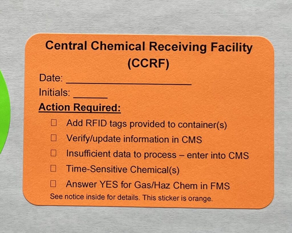 - CCRF Staff will systematically inspect, RFID tag, and verify/enter information into the Chemical Management System (CMS)