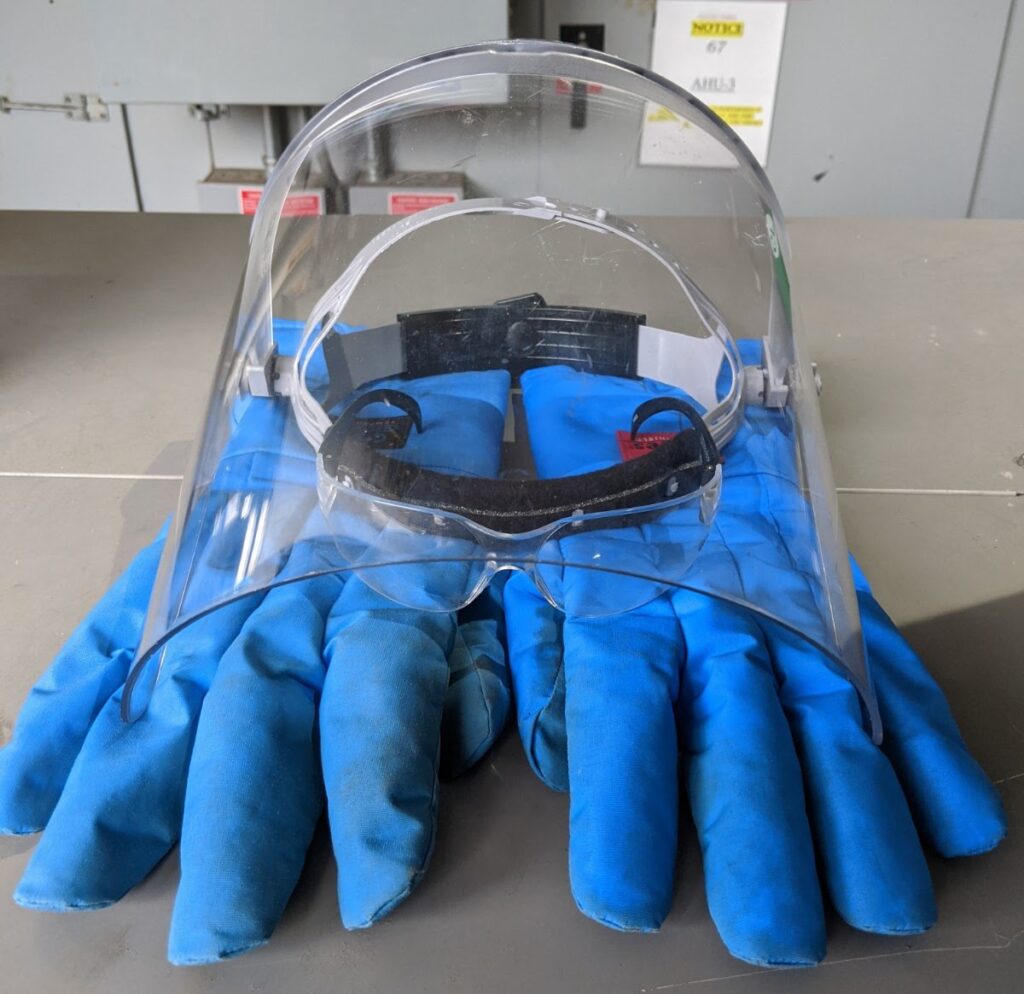 Proper Personal Protective Equipment (PPE) is a must when working with a cryogenic liquid fill station, which includes closed-toed shoes, long cuffless pants/trousers, cryo gloves, safety glasses, and a face shield. However, PPE is the last line of defense and should never be used as a primary means of protecting yourself from cryogenic liquids or cryogenically cooled objects. Cryo gloves are not intended for prolonged contact with cryogenically cooled objects, and will not protect you from immersion in cryogenic liquids, prolonged contact with a cryogenic liquid stream (more than an incidental splash) or prolonged contact with a cryogenically cooled object, such as an uninsulated hose carrying liquid nitrogen. See the PPE Selection Guide for Cryogenic Liquids and Incidents and Lessons Learned for more information on how to properly use PPE and what can go wrong when using a fill station.