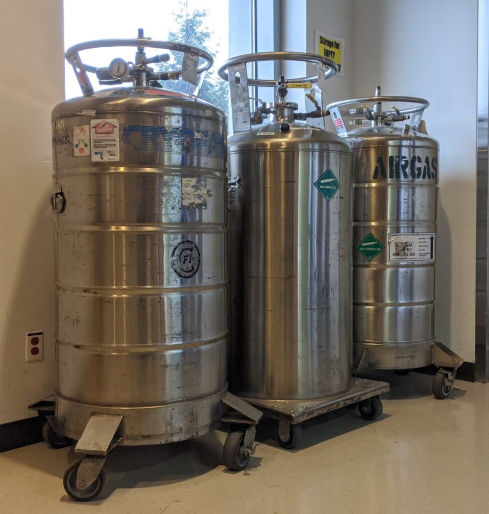 Cryogenic liquid fill stations are a long-term solution to frequent cryogenic liquid needs. Facilities and the EHS division work with a vendor to design and install a large pressurized tank outdoors. The tank can be filled from a large cryogenic liquid transport vehicle, and both gas and liquid cryogen can be withdrawn from the system. These systems are most commonly used for liquid nitrogen and can be used to fill either a low pressure Dewar or a cryogenic liquid cylinder. Often, the natural boil-off gas is also used (e.g., “house nitrogen”) after passing it through a heat exchanger to warm it to near room temperature.