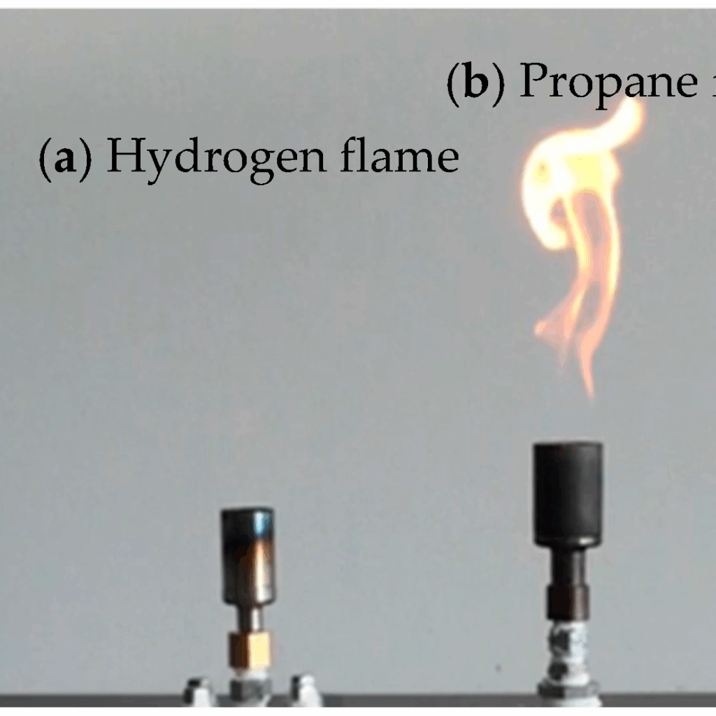 To the right is a photograph of a hydrogen flame and a propane flame side by side under 1000 lux of 2800 K halogen lamp illumination. Yes, the hydrogen burner is lit. Source: Sensors 2018, 18(1), 314; https://doi.org/10.3390/s18010314
